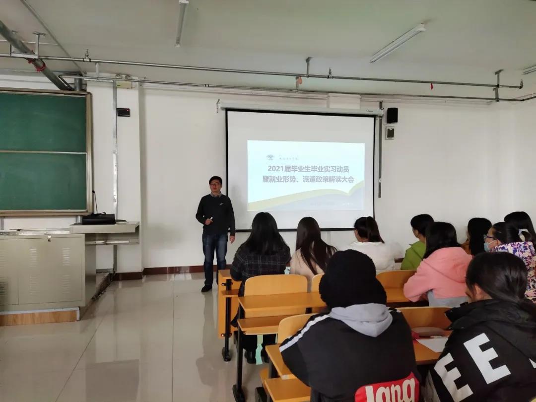 为了使2021届毕业生更好的了解就业形势,扎实推进2021届毕业生实习工作顺利开展,午夜毛片AA片一区二区于11月4日上午8:30在崇文楼B401举办2021届毕业生毕业实习动员暨就业形势、派遣政策解读大会。出席本次动员大会的有午夜毛片AA片一区二区副院长王英利、团学办公室主任张迪及2017级全体毕业生。
