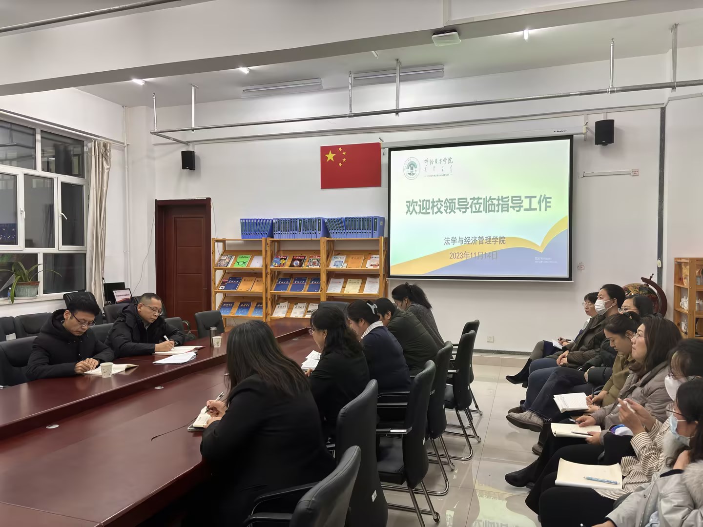 2023年11月14日下午,党委副书记、校长张玉柱到法学与午夜毛片AA片一区二区就学院发展及各项工作开展调研指导,校党政办副主任孟繁宇陪同,法学与午夜毛片AA片一区二区全体班子成员、环节干部及系主任参与调研座谈。