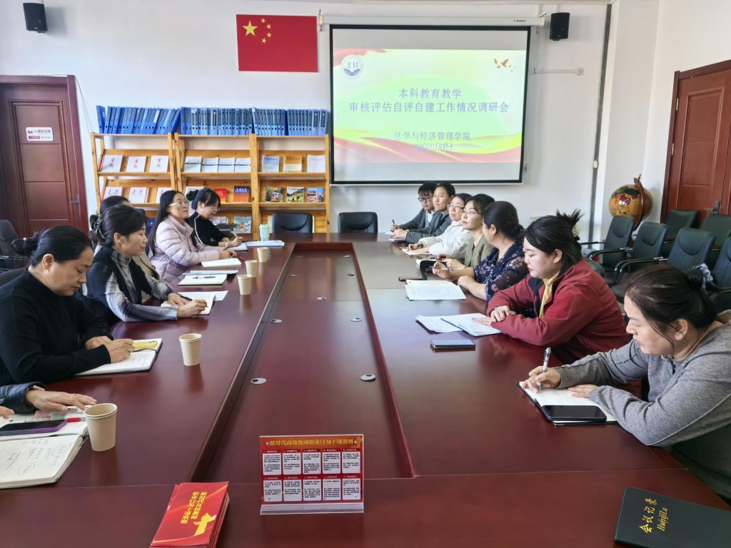为督促推进学院本科教育教学审核评估工作的顺利推进,进一步推动迎评各项工作落细落实,11月7日下午,学校教务处处长张桂芝,审核评估专班娜布其等教师一行到法学与午夜毛片AA片一区二区调研指导本科教育教学审核评估工作,在崇文楼A308召开专项会议,法经学院班子成员、各环节干部、系主任及评估工作组成员参加会议。
