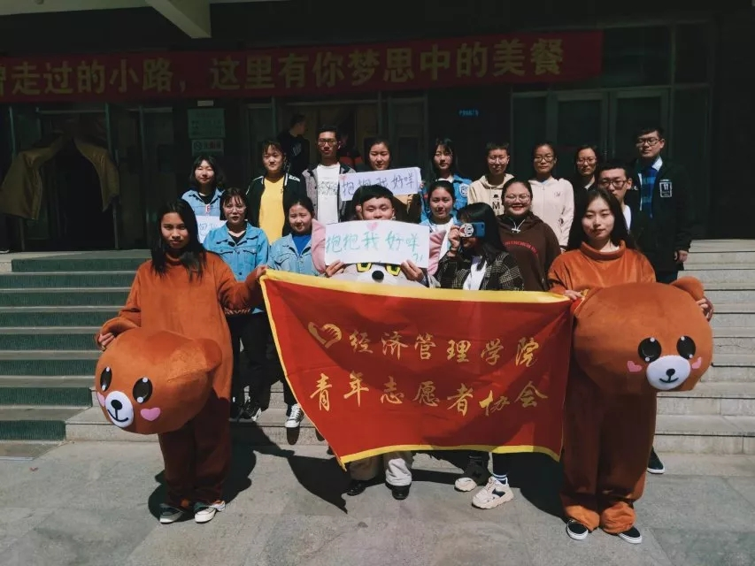 为了传递温暖,重拾人与人之间最温暖的爱,让人充满爱和能量,2019年 4月 27日上午十点半到下午一点半经理管理学院青年志愿者协会在食堂、小二楼以及 11号宿舍楼附近举办了人偶拥抱活动。出席本次活动的有文体部部长杨带兵,以及青年志愿者者协会部分成员。